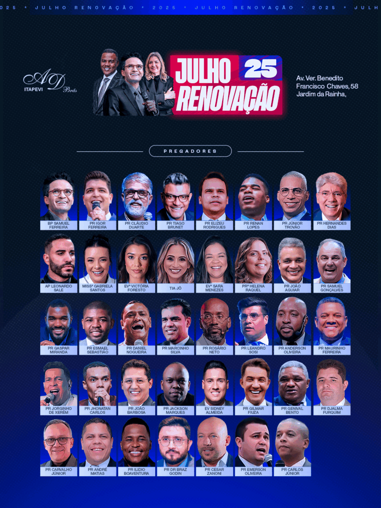 O palco do Julho também recebe a cada noite ministrações poderosas de pregadores que têm sido voz profética para esta geração. A edição 2025 reúne pastores e líderes que estão na linha de frente do evangelho no Brasil, como:
